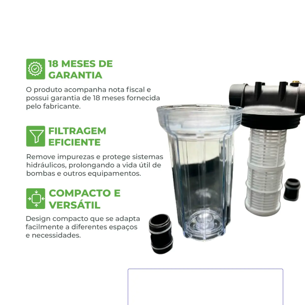 O Filtro de Água Eurobombas é um filtro de água para bomba d'água, unindo praticidade de manutenção com baixo consumo de água.