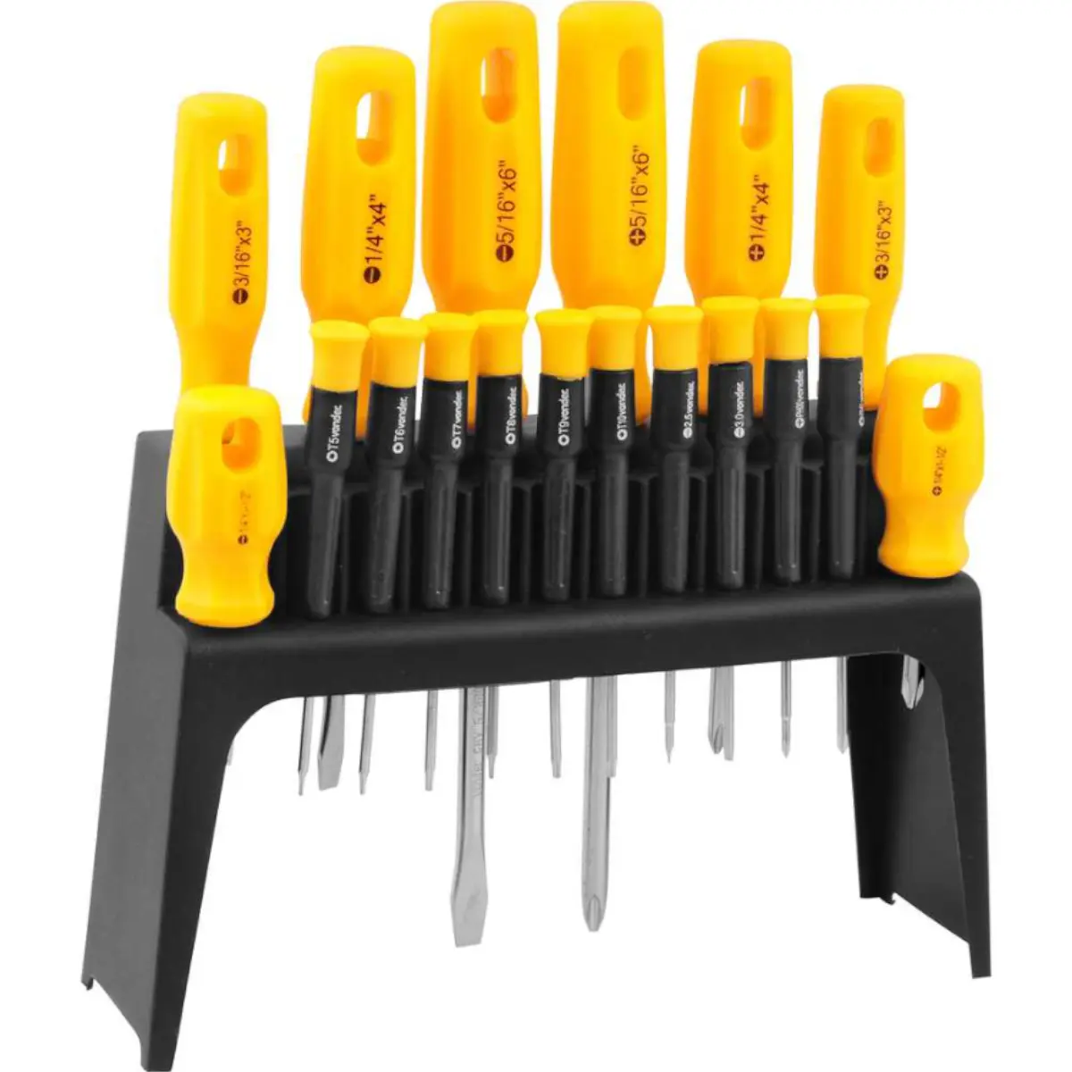 - Versatilidade Completa: 18 peças que cobrem os perfis de parafusos mais utilizados (Fenda, Phillips e Torx).- Durabilidade Superior: Haste em aço Cromo Vanádio, material de alta resistência, que garante maior vida útil ao produto.