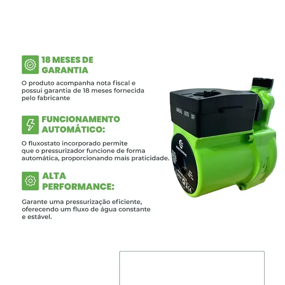 O Pressurizador de Água Eurobombas, é indicado para sistemas de pressurização de água limpa em aplicações residenciais e prediais. Possui fluxostato incorporado para funcionamento automático. Produto de alta qualidade e performance e de baixo consumo elétrico.